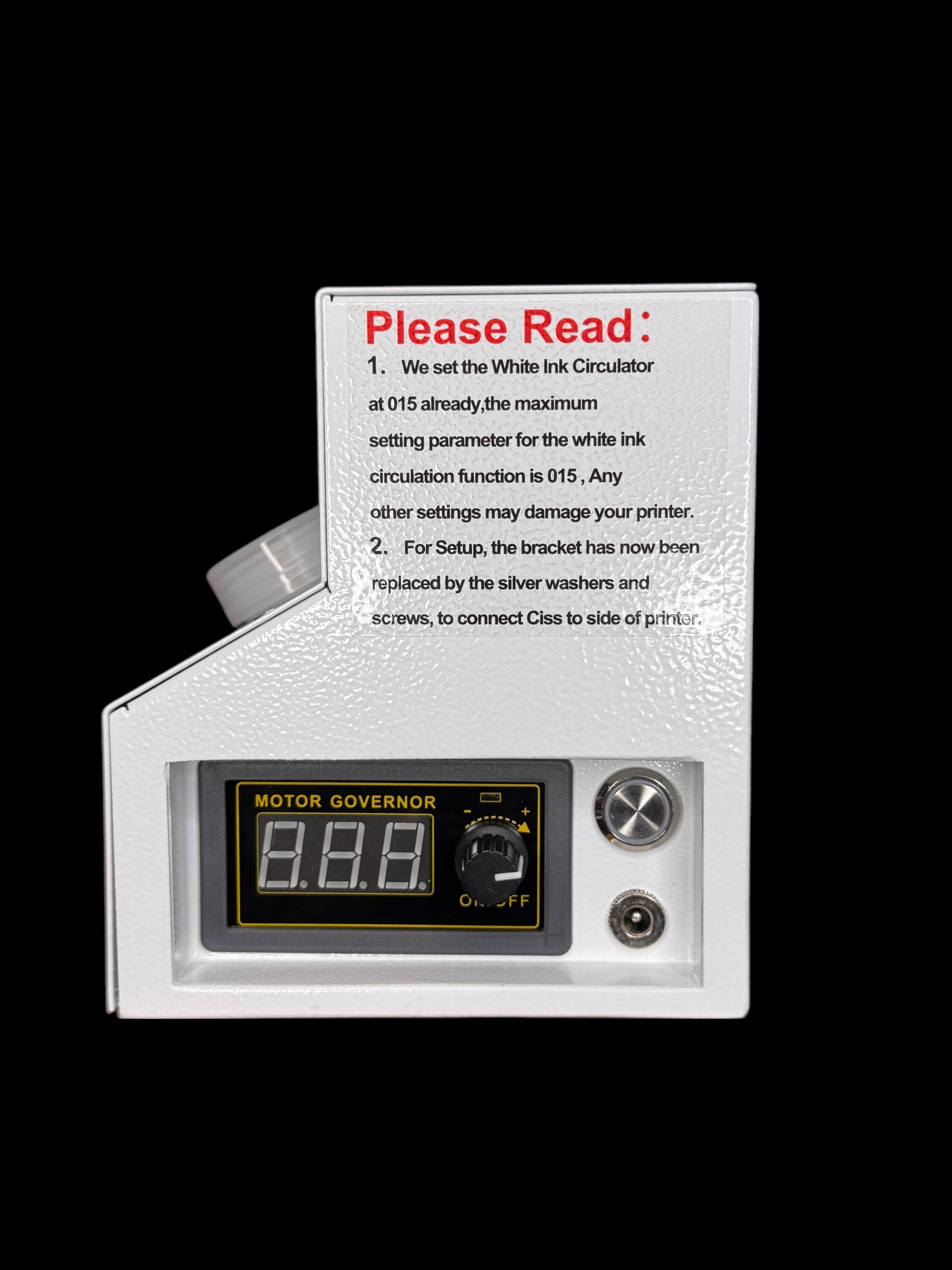 As far as a daily routine, you simply turn the circulation pump and mixer on for 1-2 minutes. We personally use it for no more than 1 minute, that is plenty. After that, you turn off pump/mixer and run a print head cleaning. That's it for your routine, simple and allows you to focus your time on prints instead of clog issues. While you can dial up the speed on the white circulation pump, it is not recommended to go any higher than the set speed which is 0.15. Any higher, and you risk flooding your print head with white ink. If you happen to run into any issues down the road with faint white ink lines or anything regarding white, it is more than likely due to dried up ink on bottom of print head. The recommended method for resolving that is the "shoeshine" method on print head.
