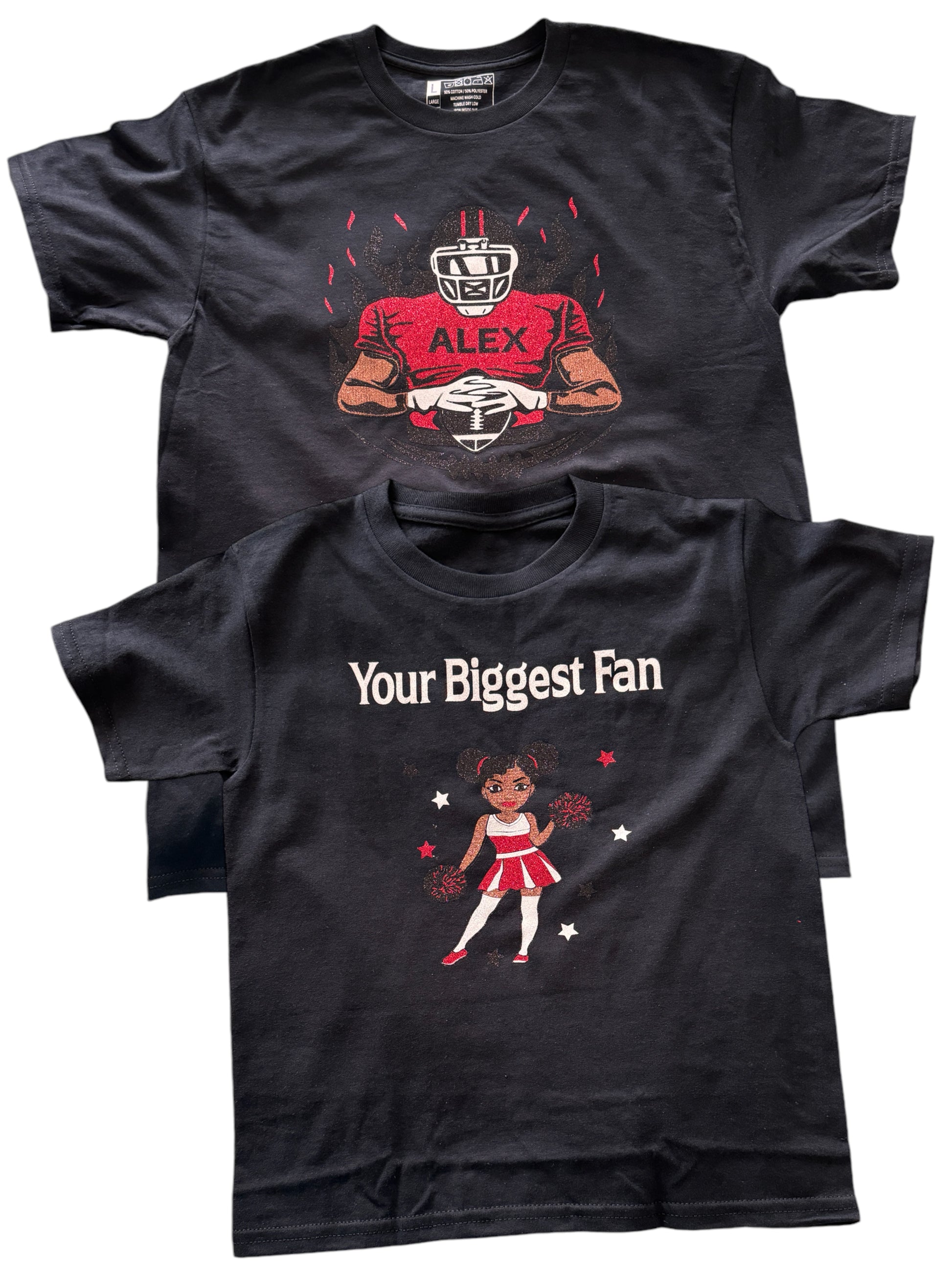 Glitter Shirts are a fantastic way to add some sparkle to your look for football season, birthday parties, and special events! Choose from a variety of colors to match any occasion. All items are custom-made to order.